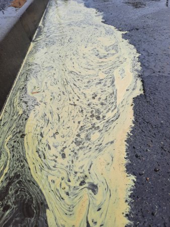 На фото видно, як узбіччя вкрилися характерними жовтими слідами, що виглядають як суміш пилку або інших домішок із дощовою водою. Подібні явища найчастіше виникають у весняний період і можуть бути пов’язані з великою кількістю пилку в повітрі або пиловими бурями, які змішуються з атмосферними опадами.