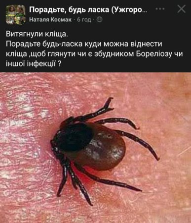 Закарпатці активно б'ють на сполох у соціальних мережах через укуси кліщів. Зокрема, жителі Ужгородського району діляться своїми випадками та шукають поради щодо того, куди звернутися для перевірки кліща на наявність інфекції.