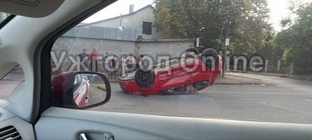 Ужгород, Закарпатська область — Незвичайна та вражаюча дорожньо-транспортна пригода сталася сьогодні в Ужгороді: на перехресті вулиць Довженка та Тельмана автомобіль червоного кольору перекинувся на дах.
