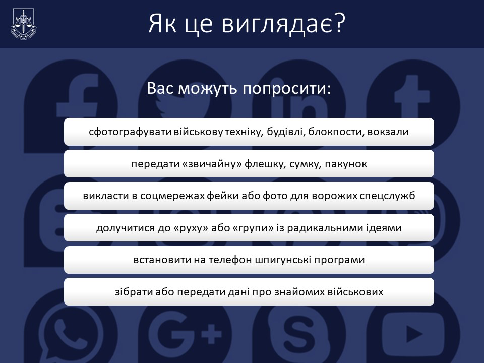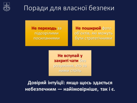 викласти у соцмережах фейки або фото для ворожих спецслужб;