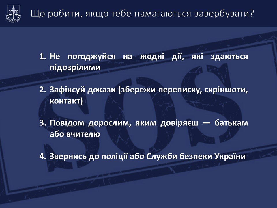 Батьки, друзі, вчителі та й самі діти мають бути максимально поінформовані про те, якими методами працюють ворожі спецслужби та як вербують людей. Це дасть змогу зрозуміти де та за яких обставин можна чекати небезпеки.