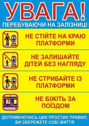 ПАМ’ЯТАЙТЕ! Машиніст локомотива не може відразу зупинити поїзд і попередити наїзд. Візуально, особливо в темний період доби, дуже важко визначити, з якою швидкістю прямує поїзд. Помилка при оцінці швидкості поїзда часто коштує людині життя.