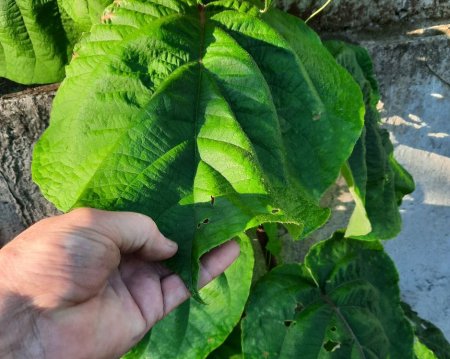 📸 На фото – реальний приклад листя ківі, що виросло на приватній садибі в місті Виноградово. Величезна зелена поверхня свідчить про надзвичайно сприятливі умови для вегетації.