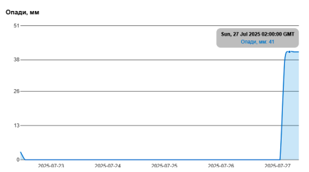 В ніч на 27 липня 2025 року над Закарпаттям пройшов потужний грозовий фронт зі штормовим вітром, блискавками та інтенсивними опадами. За даними автоматичних гідрологічних станцій, в окремих районах області випало до 41 мм опадів.