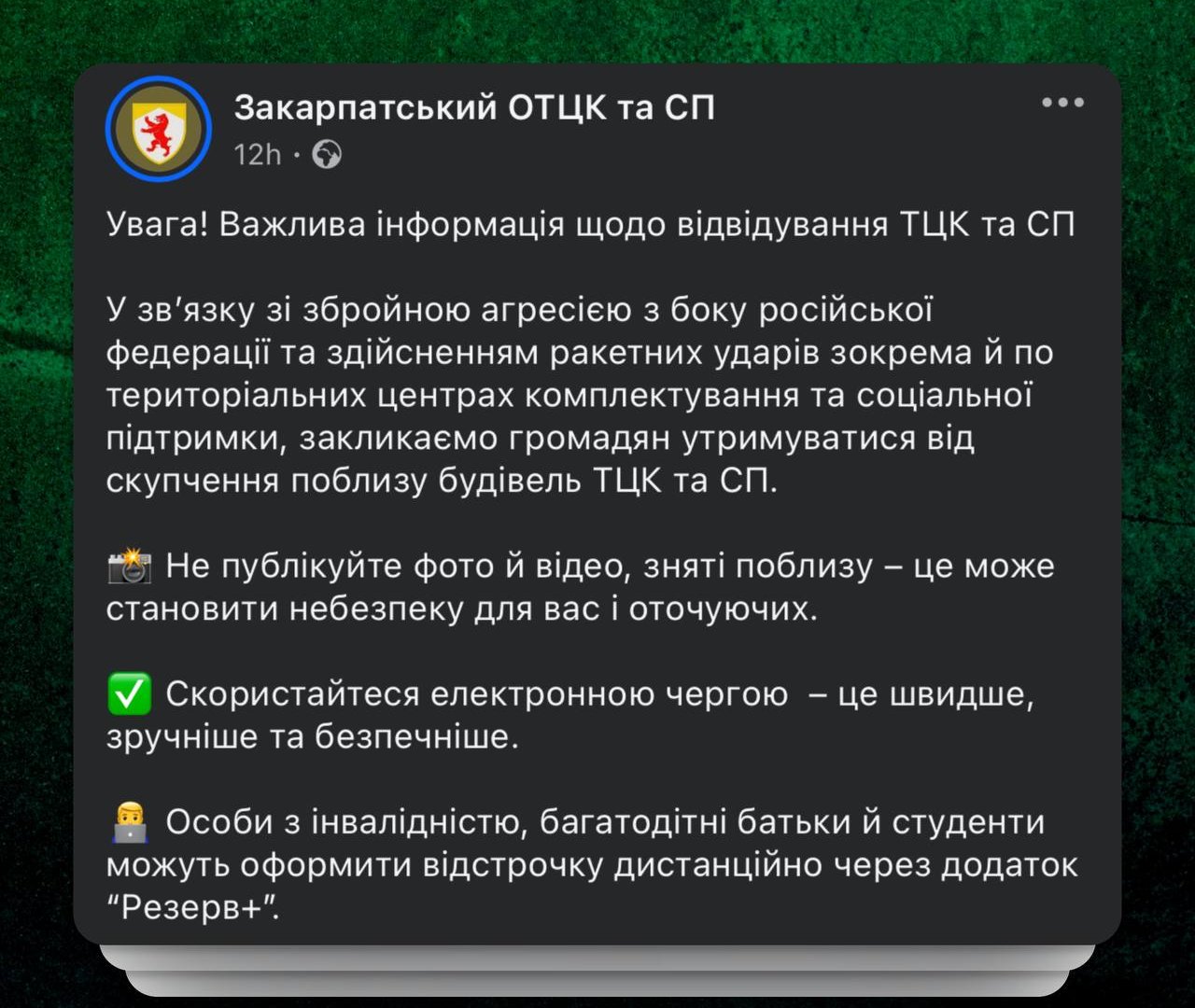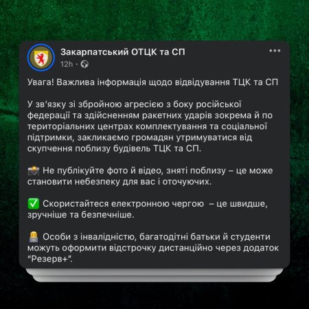 Закарпатський обласний ТЦК та СП оприлюднив важливе попередження для мешканців області. У зв’язку з триваючою агресією РФ та ризиком ракетних ударів, зокрема по територіальних центрах комплектування, громадян закликають утримуватися від скупчень поблизу таких об’єктів.