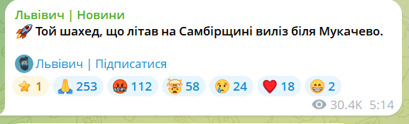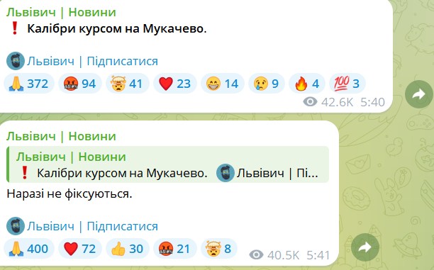 Моніторингові Telegram-канали, що відстежують рух повітряних цілей, повідомили про рух одного з "Шахедів" у напрямку Мукачева. Крім того, на мапі руху повітряних цілей над Україною були позначені крилаті ракети, що летіли в бік Закарпаття. Наразі офіційної інформації від влади чи військових щодо цієї події немає.
