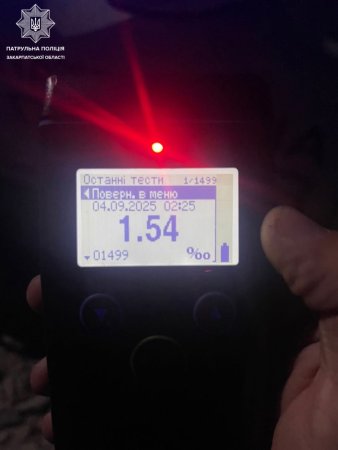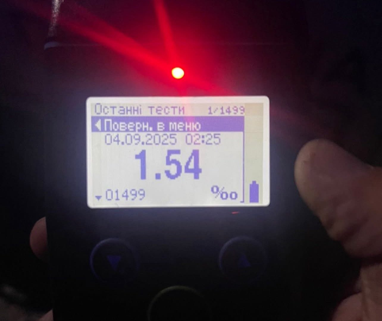 Під час перевірки документів у водія виявили ознаки алкогольного сп’яніння. Чоловік погодився пройти огляд на місці. Результат тесту — 1,54‰ алкоголю в крові.