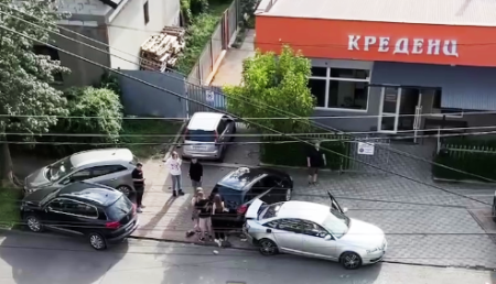 В Ужгороді на вулиці Закарпатській сталася незвичайна дорожньо-транспортна пригода, в якій фігурують одразу чотири автомобілі. За попередніми даними, одне з авто врізалося в інше, що спровокувало ланцюгову реакцію і зачепило ще два припарковані автомобілі.