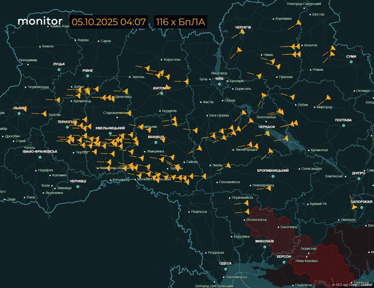 Близько четвертої години ранку системи спостереження повідомили про рух щонайменше 116 безпілотників Shahed, запущених з південного напрямку. За попередніми даними, об’єктами ударів є енергетична інфраструктура та військові об’єкти в центральних і західних регіонах.