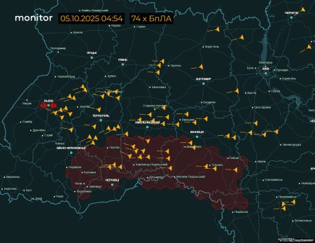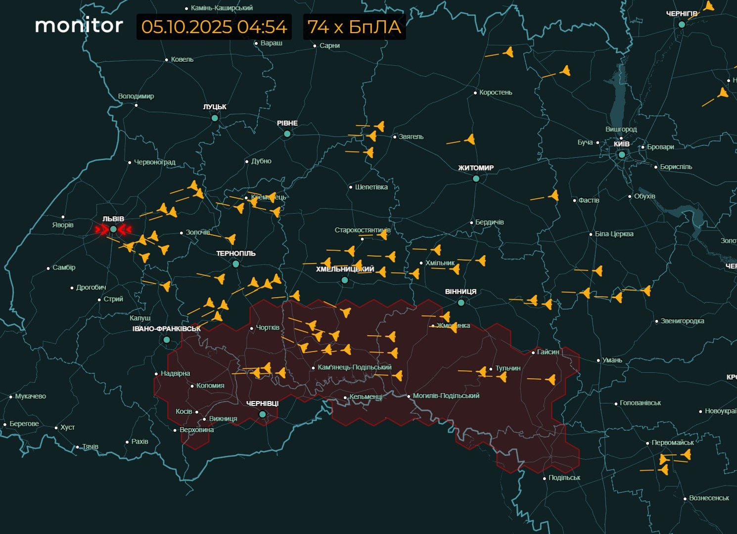 У ніч на 5 жовтня російські війська здійснили масовану атаку дронами по території України. За даними моніторингових ресурсів, у повітрі зафіксовано понад сотню безпілотників, частина з яких прямує у напрямку західних областей. Повітряна тривога оголошена по всьому Закарпаттю.
