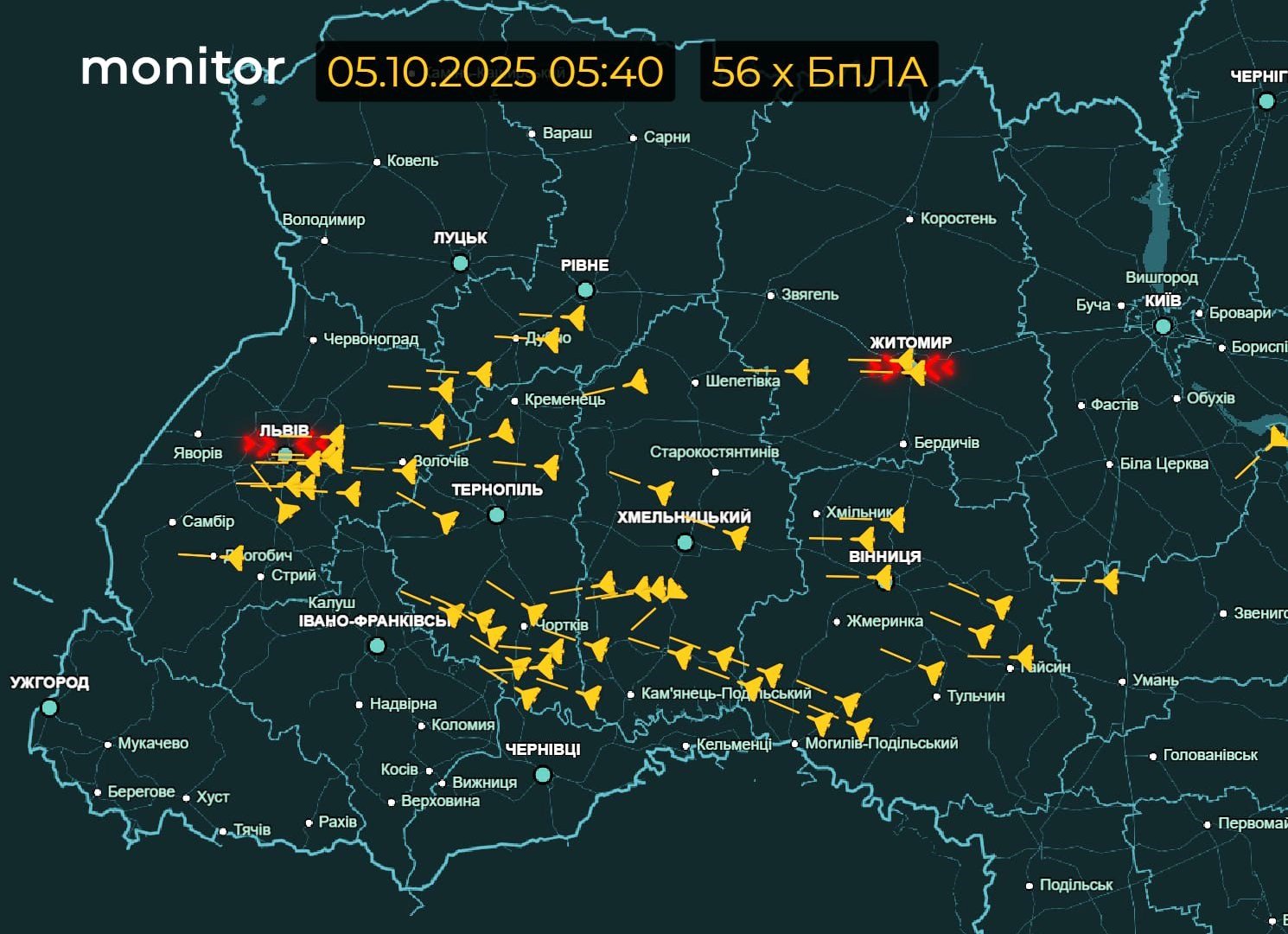 У Львові та Житомирі зафіксовані вибухи — ці міста наразі перебувають під інтенсивною атакою. На карті спостерігається активний рух дронів через Тернопільщину у бік Івано-Франківщини, а також окремі цілі, що можуть наближатися до Закарпаття.