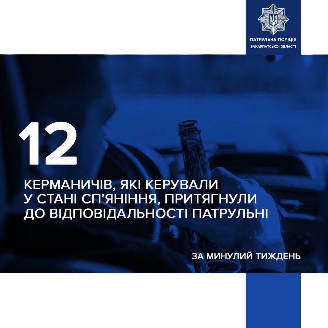 За минулий тиждень поліцейські притягнули до відповідальності 12 водіїв, які керували у стані сп’яніння.