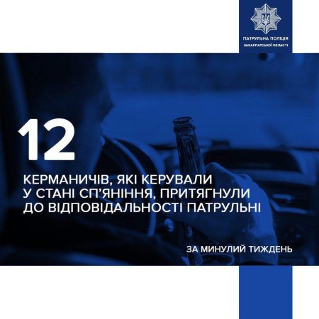 За минулий тиждень поліцейські притягнули до відповідальності 1️⃣2️⃣ водіїв, які керували у стані сп’яніння.