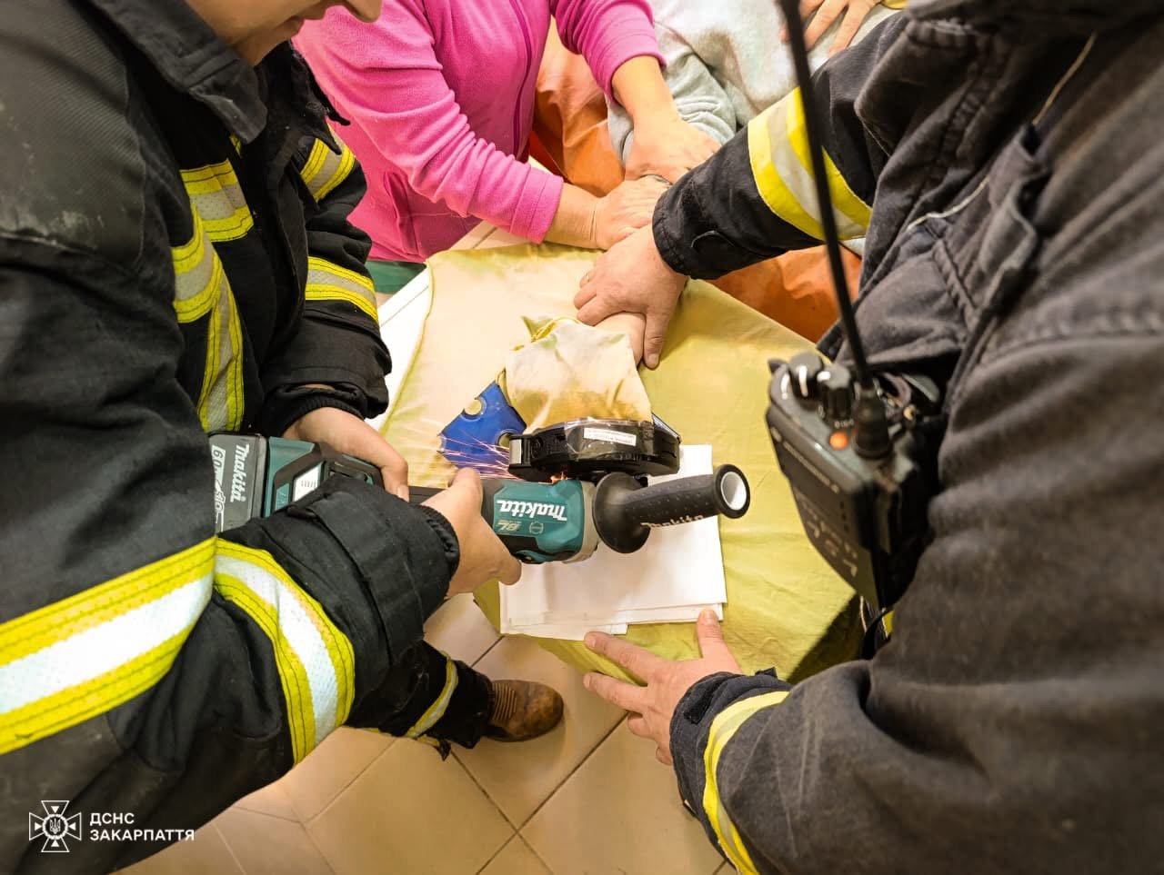 Зрештою, батьки викликали рятувальників і медиків. На місце прибули фахівці з Іршави, які за допомогою «болгарки» обережно відрізали частину гойдалки.