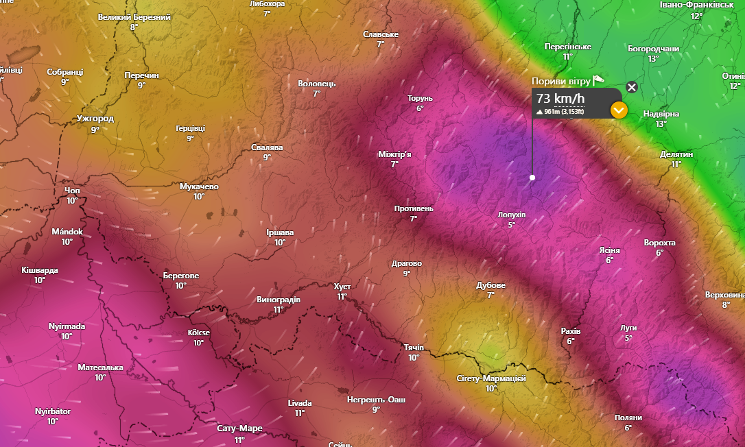 Ужгород, 24 жовтня 2025 року. На територію Закарпаття насувається потужний штормовий фронт. За даними синоптиків, у гірських районах області очікуються пориви вітру до 73 км/год, місцями з сильними опадами. Найбільш інтенсивні вітри прогнозують у районах Міжгір’я, Рахова, Лопухова та Ясіні.