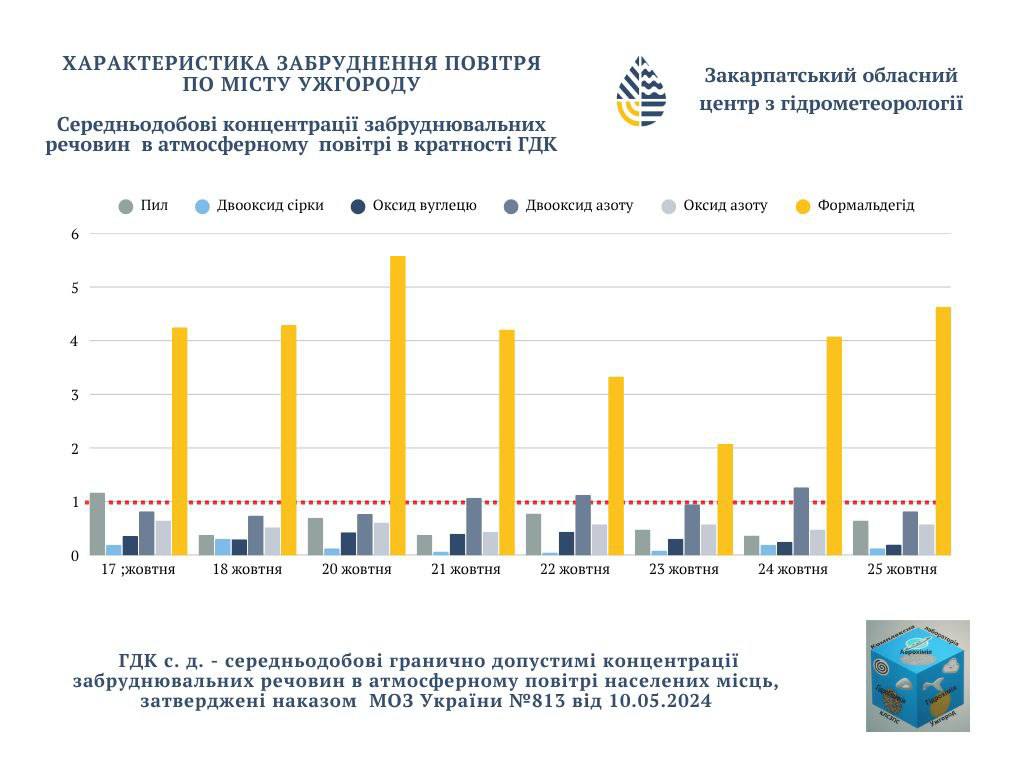 За даними Закарпатського обласного центру з гідрометеорології, у період із 17 по 25 жовтня 2025 року в атмосферному повітрі Ужгорода зафіксовано стійке перевищення концентрацій забруднювальних речовин, зокрема формальдегіду.