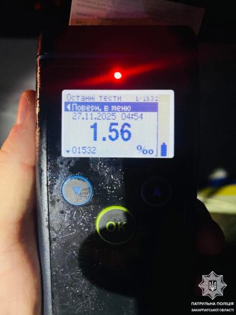 Під час спілкування поліцейські помітили в керманича явні ознаки алкогольного сп’яніння: різкий запах алкоголю, тремтіння рук та порушену координацію. Огляд на місці за допомогою алкотестера підтвердив підозри — 1,56‰ алкоголю. Крім того, водій був позбавлений права керування.