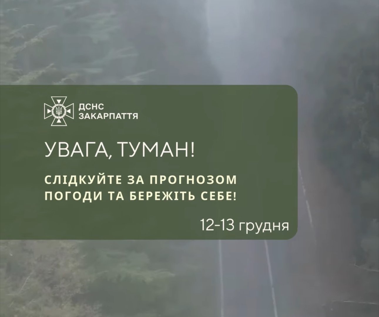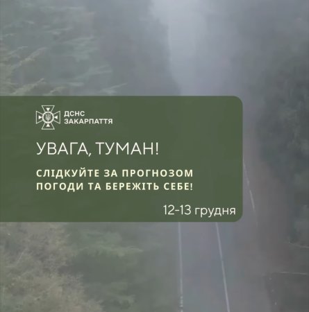 Синоптики попереджають про погіршення видимості на дорогах Закарпатської області. Ввечері 12 грудня, вночі та вранці 13 грудня на більшій частині регіону та в місті Ужгород очікуються тумани з видимістю 100–500 метрів. Їхня тривалість становитиме три години і більше.