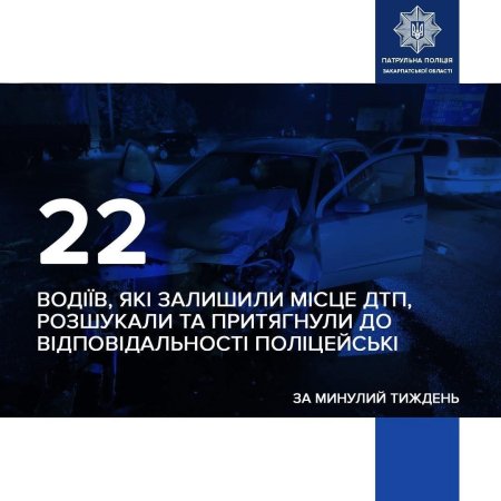 За минулий тиждень поліцейські Поліція Закарпатської області встановили та розшукали 22 водіїв, які після дорожньо-транспортних пригод самовільно залишили місце ДТП.