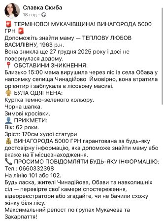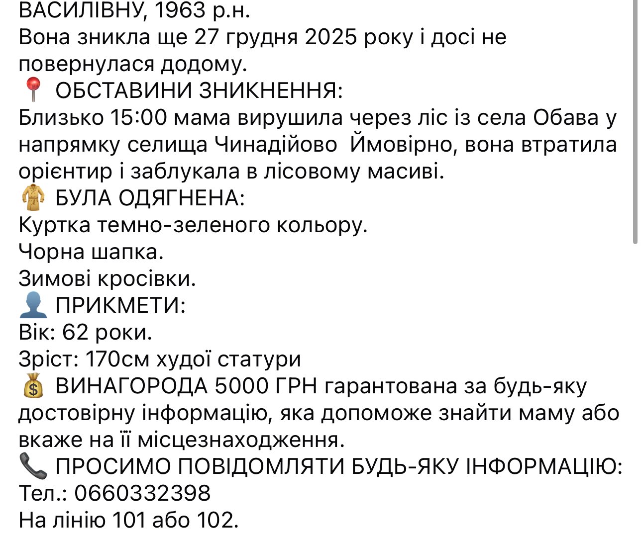 Усіх, хто володіє будь-якою інформацією або міг бачити жінку в районі лісу чи населених пунктів Обава, Чинадійово та навколишніх сіл, просять повідомити за телефоном 066 033 23 98 або звернутися на лінії екстрених служб 101 чи 102.
