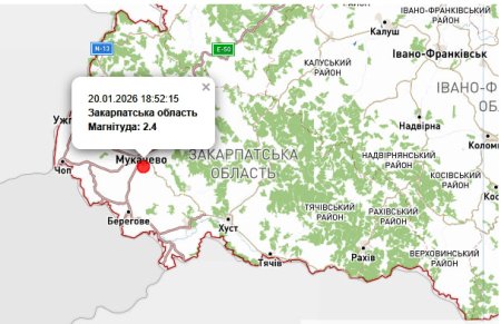 20 січня 2026 року о 18:52 у Закарпатській області стався землетрус магнітудою 2.4 з епіцентром поблизу міста Мукачево. Глибина осередку становила 10 км. Про це повідомляє Головний центр спеціального контролю (ГЦСК). - повідомляє https://transcarpathia.news/