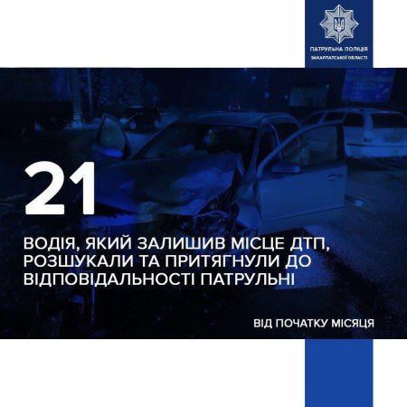 Із початку місяця поліцейські Національна поліція України в Закарпатській області встановили місцеперебування 21 водія, які залишили місце дорожньо-транспортної пригоди.