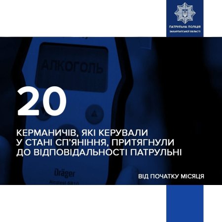 Патрульні Патрульна поліція Закарпатської області повідомили про посилення контролю за водіями, які сідають за кермо у стані сп’яніння. Від початку місяця правоохоронці притягнули до відповідальності вже 20 порушників.