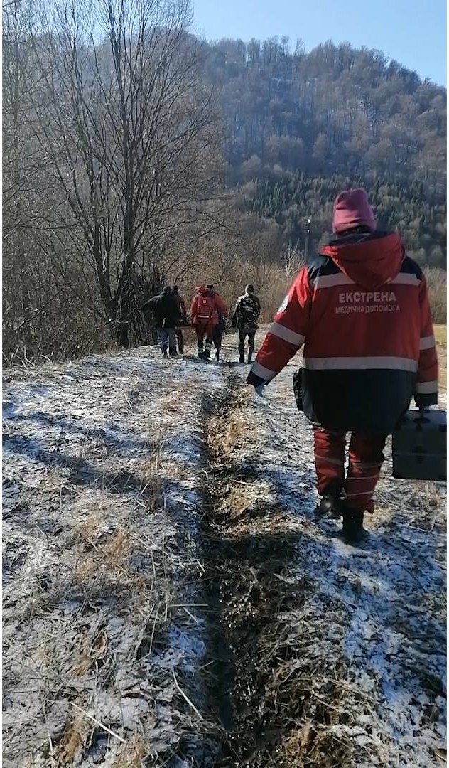 З’ясувалося, що пацієнт знаходиться глибоко в лісі, куди не прокладено доріг. Медики прийняли героїчне рішення — долати шлях пішки. З повним медичним спорядженням та важкими ношами в руках бригада майже бігом подолала кілька кілометрів крутого підйому через густі закарпатські хащі.