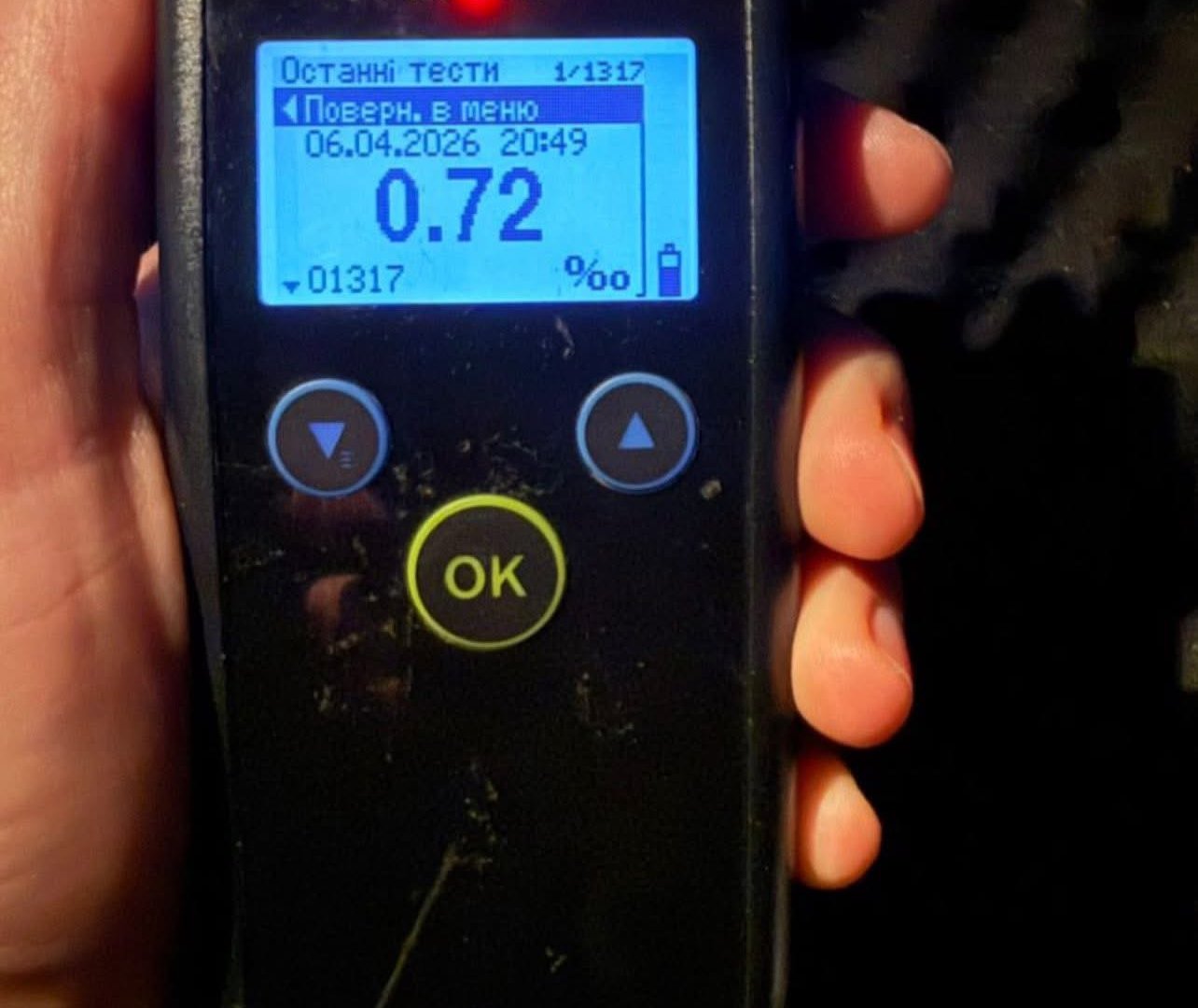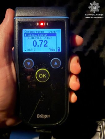 Результат виявився позитивним — 0,72 проміле алкоголю в крові, що значно перевищує допустиму норму.
