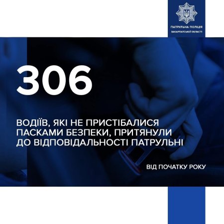 На Закарпатті патрульні поліцейські продовжують фіксувати порушення правил безпеки на дорозі. Від початку року винесено вже 306 постанов за керування або поїздки без пристебнутого ременя безпеки.