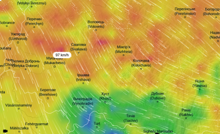Хуст та Виноградів: відносно спокійніша зона (до 50 км/год), проте фронт рухається на південний схід.