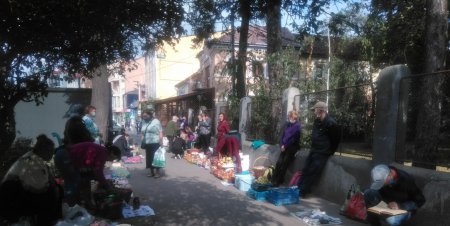 В Ужгороді біля хімічного факультету люди розгорнули вуличну торгівлю. На пішохідній зоні жінки продають городину, дари лісу, фрукти. Крам розкладений по обидва боки.