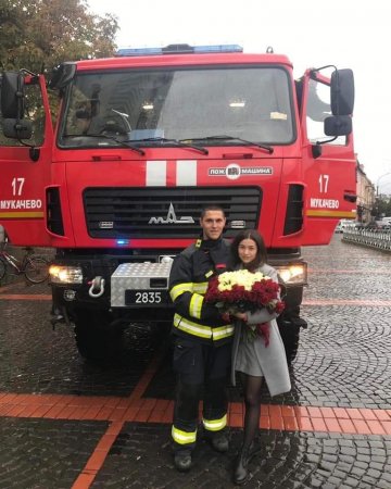 Днями в Мукачеві пожежник Владислав Севч освідчився коханій Мирославі в дуже зворушливий спосіб: у день її народження призначив зустріч біля міської ратуші, а сам приїхав на пожежній машині в бойовому спорядженні зі 101 трояндою та каблучкою в руках.