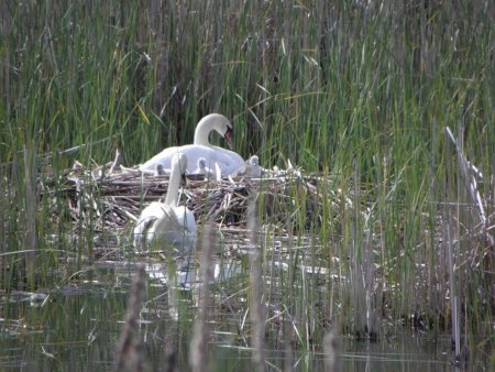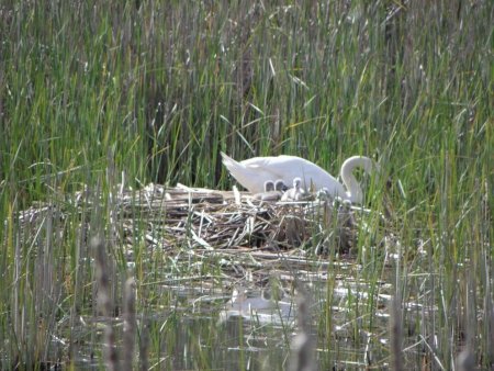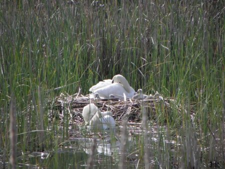 Точну кількість пташат ніхто не знає, проте їх є більше шести, що є рекордом для озера "Кірпічка". Сьогодні лебедята вперше покинули гніздо і разом з мамою вчилися плавати. Відвідувачів озера просять зважати на присутність малечі.