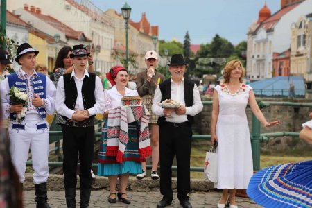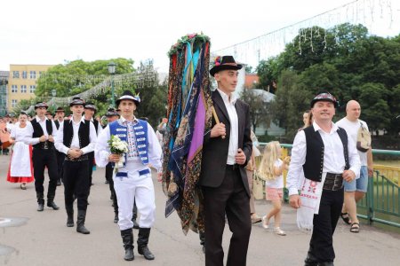Міську «свадьбу» сьогодні провели за всіма традиціями, зі співами й танцями. Урочисто від дому нареченого – з площі Євгена Фенцика – весільна процесія пройшла святково оздобленим пішохідним мостом на площу Шандора Петефі – до, за сюжетом, дому нареченої.