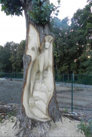 Дерева, вочевидь, планувалося зрізати при розширенні території навколо динопарку, а потім виникла ідея зробити в них скульптури. Після такої "операції" дерева з часом остаточно всохнуть.
