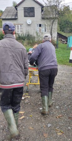 Вже за мить фельдшер Влада КОСМИНКА та водій Тиберій ШВАМБЕРГ 🚑мчали на виклик. Однак, дістатися до пацієнтки автівкою «швидкої»🚑 було неможливо: через ⛈ рясні дощі ґрунтова дорога перетворилася у суцільне болото. Бригаді довелося взяти все необхідне із собою і навпростець, 🌲🌳⛰ лісом та багнюкою, добиратися до пацієнтки майже 40 хвилин… Після огляду хворої та надання їй екстреної медичної допомоги, фельдшерка прийняла рішення про необхідність госпіталізації пацієнтки. Але постало питання – як транспортували хвору до автівки 🚑«швидкої» - самостійно жінка була неспроможна пересуватися.
