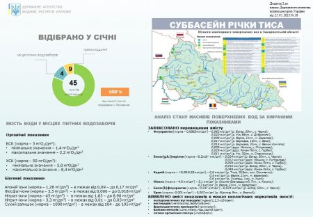 "У січні програма державного моніторингу вод виконана на 100%. На слайді представлено дані щодо якісного стану водних об’єктів за результатами моніторингу поверхневих вод у січні 2023 року", - зазначають у БУРВ Тиси.