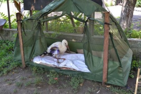 Щоб захистити лелеку вiд мух, його помiстили в затишний намет.