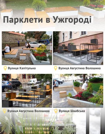 Чотири парклети у межах реалізації міжнародного проєкту «SUMCITYNET: міста за покращення доступності і кліматично-сталу міську мобільність», встановили в Ужгороді на вулицях Швабській, Августина Волошина та Капітульній.