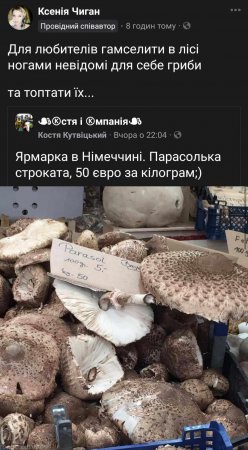Користуються чималим попитом гриби - зонтики на місцевих базарах Чехії, Польщі, де вони коштують не малі гроші. В мережі Фейсбук виставили фото з грибами на одному із ярмарків у Німеччині, де кілограм вартував 50 євро.