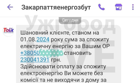 Через збій у роботі "Закарпаттяенергозбут" споживачі отримали помилкове повідомлення, у якому зазначається про нібито наявність боргу за спожиту енергію у сотні мільйонів гривень