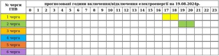 До уваги споживачів графік погодинних включень/відключень електроенергії на 19.08.2024