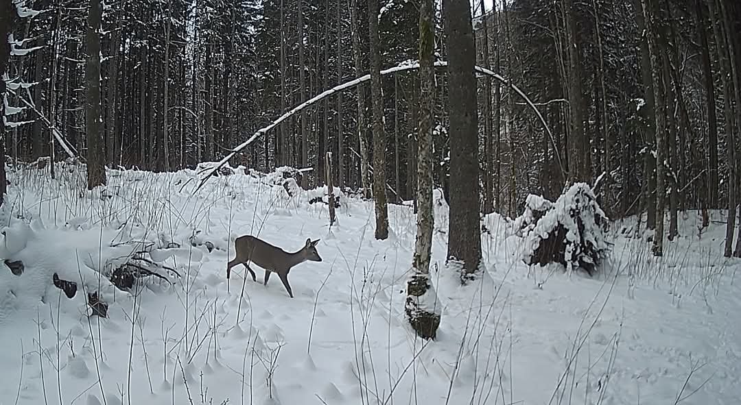 🌲Цей кадр зафіксувала фотопастка, встановлена взимку на території Карпатського біосферного заповідника. Навколо глибокий сніг, мороз, а ліс живе — повільно, обережно, по-зимовому. На фото — козуля європейська (Capreolus capreolus), одна з найтиповіших мешканок наших гірських екосистем.