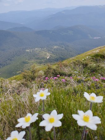 Тисячі яскравих квітів перетворюють схили Говерли на мальовничий килим, що дивує розмаїттям кольорів та форм. Червона рута, овіяна міфами та легендами, розкриває свої вогняні пелюстки, наповнюючи повітря тонким ароматом. Поруч з нею, ніжні, пухнасті квіти сон-трави, відтінки яких варіюються від насиченого фіолетового до блідо-бузкового, створюють атмосферу спокою та казковості.