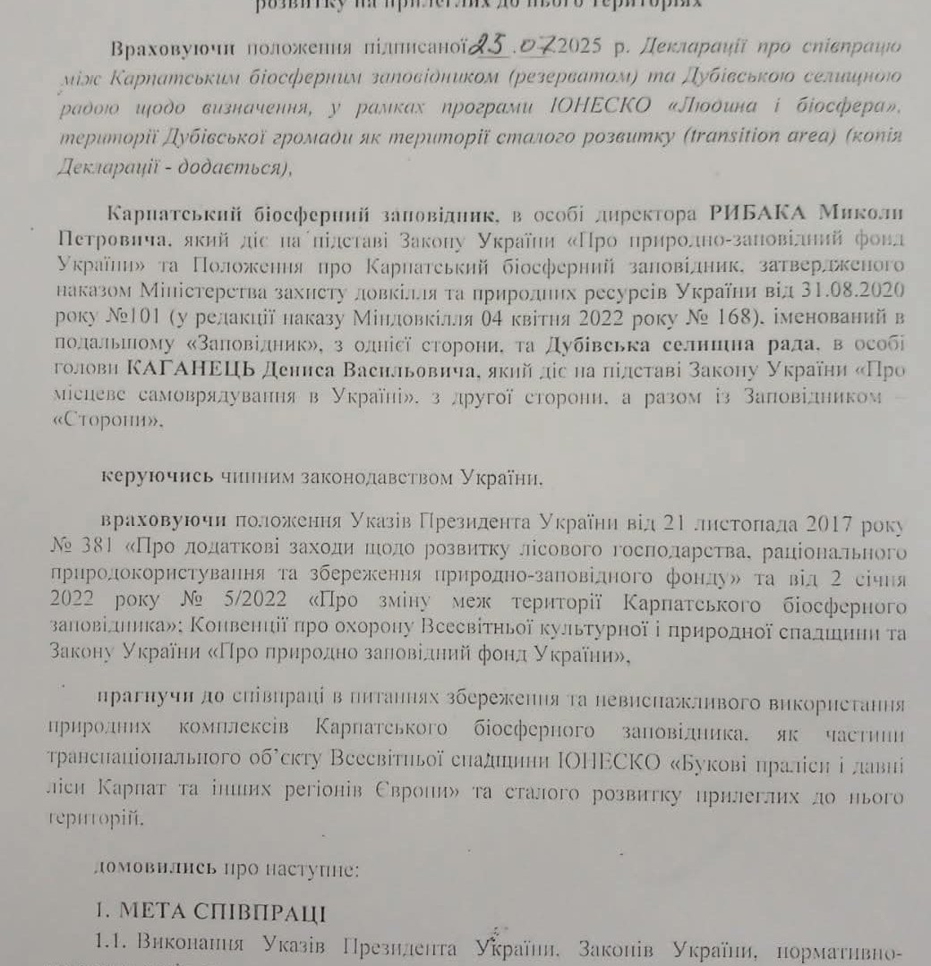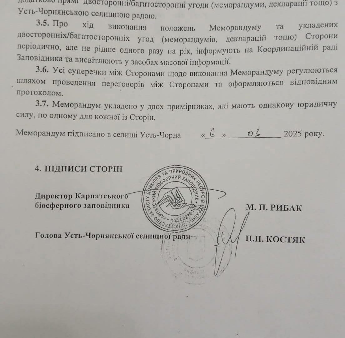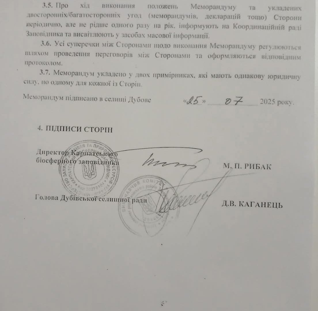 В рамках роботи сектору Координаційної ради в Тячівському районі директор Заповідника, заслужений природоохоронець України Микола Рибак підписав Меморандуми про співпрацю з Усть-Чорнянською селищною радою (голова Петро Костяк) та Дубівською сільською радою (голова Денис Каганець).