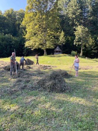Співробітники заповідника косять і складають сіно, а також готують трав'яні суміші та віники. Цей корм стане важливою підтримкою для диких мешканців лісу, особливо для оленів, козуль та інших копитних, яким важко знайти їжу, коли пасовища вкриває сніг.