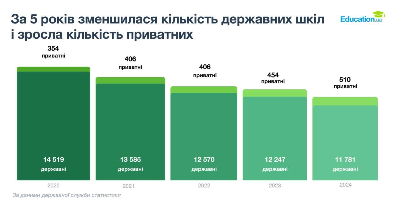 Загалом по Україні за останні п’ять років кількість державних шкіл зменшилася на 19%. Водночас приватних навчальних закладів стало більше — нині їх налічують 510.