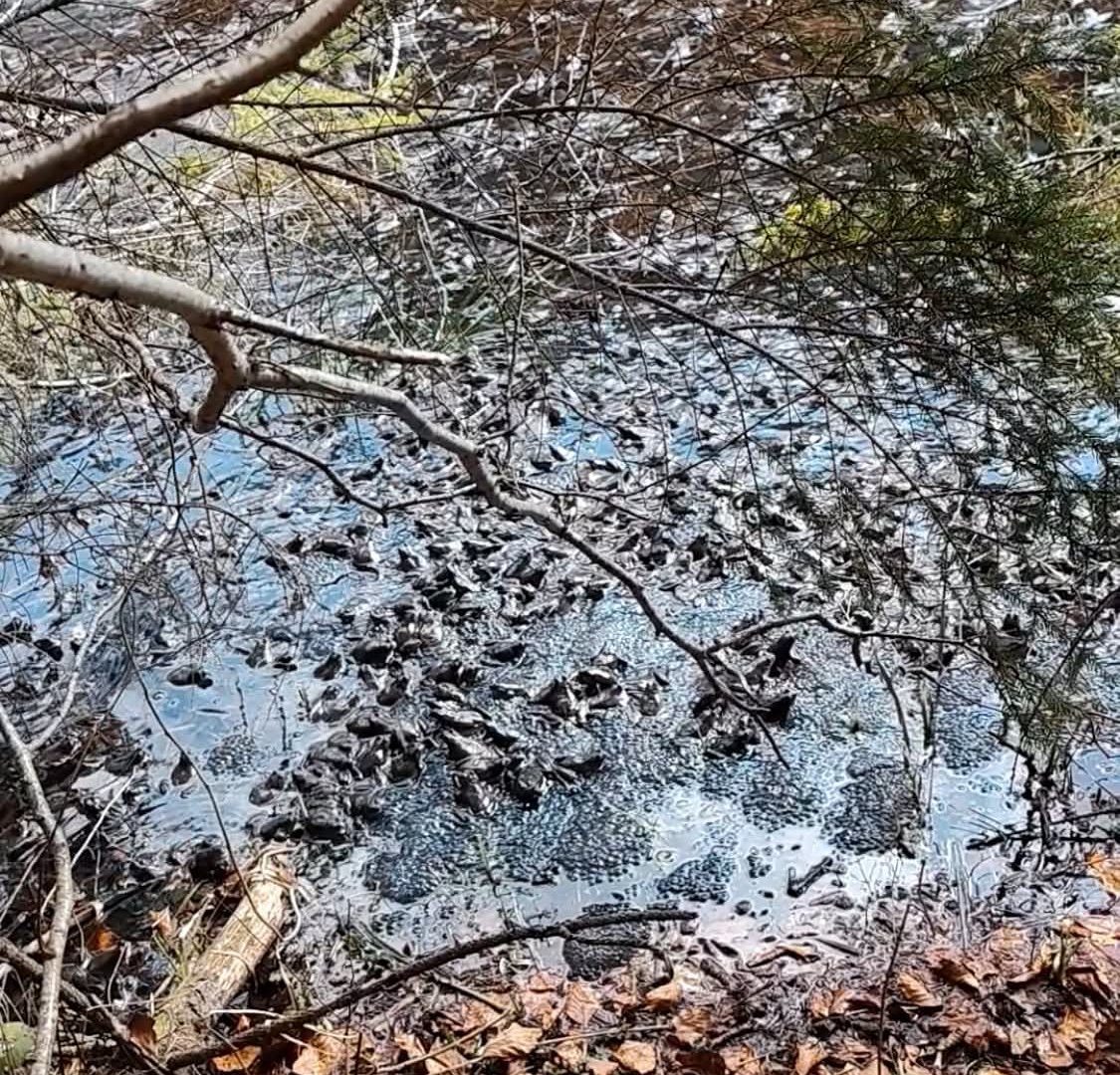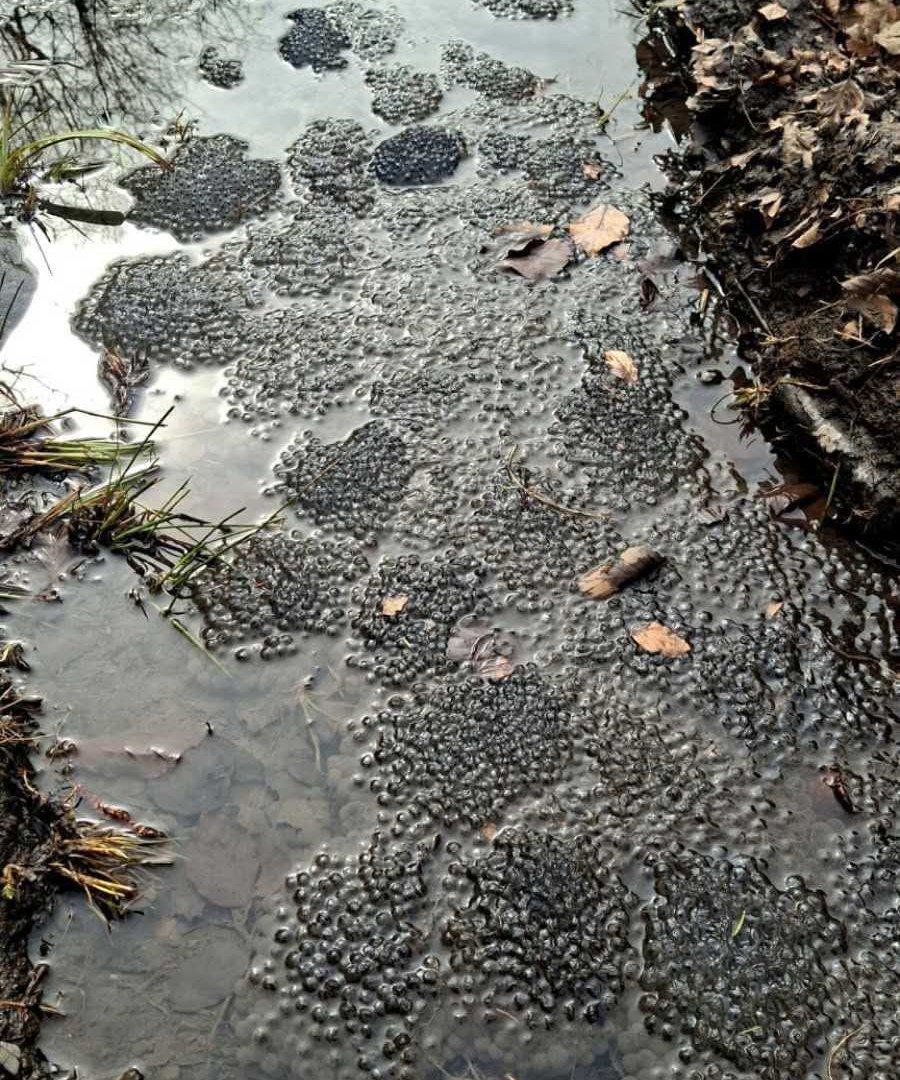Бурі жаби (лісові): Трав’яна, гостроморда та прудка. Весь рік вони ховаються в хащах, але зараз утворюють величезні, подекуди шокуючі скупчення у воді.