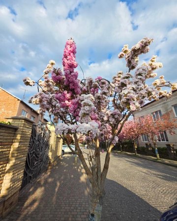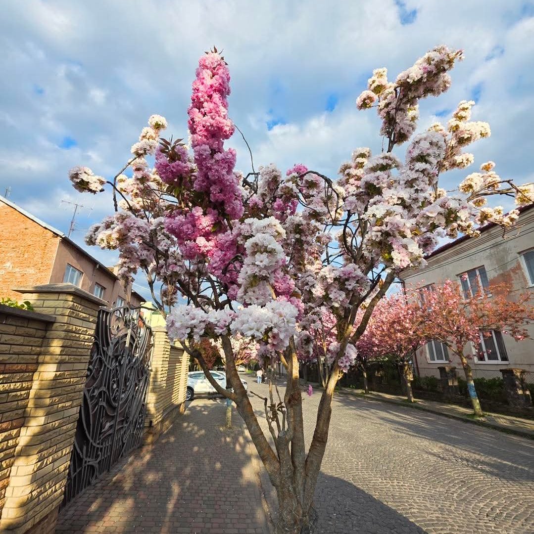 Мукачево знову підтверджує статус столиці сакур, але цього разу — з сюрпризом. На вулиці Королеви Єлизавети (колишня назва — Маршала Плієва) зацвіла незвичайна сакура, яка за лічені дні стала найпопулярнішою локацією для фотополювань.